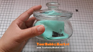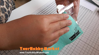 Voordat je je stempeldoek gebruikt, leg je hem een paar seconden in het water of totdat hij een beetje vochtig is en klaar om aan te brengen. Hier inkt ik mijn stempel en stempel het op het papier. Na het stempelen op het papier maak ik het schoon met mijn Stamp Shammy met een beetje vochtig water. Geen schoonmaakmiddelen nodig, voeg gewoon water toe.